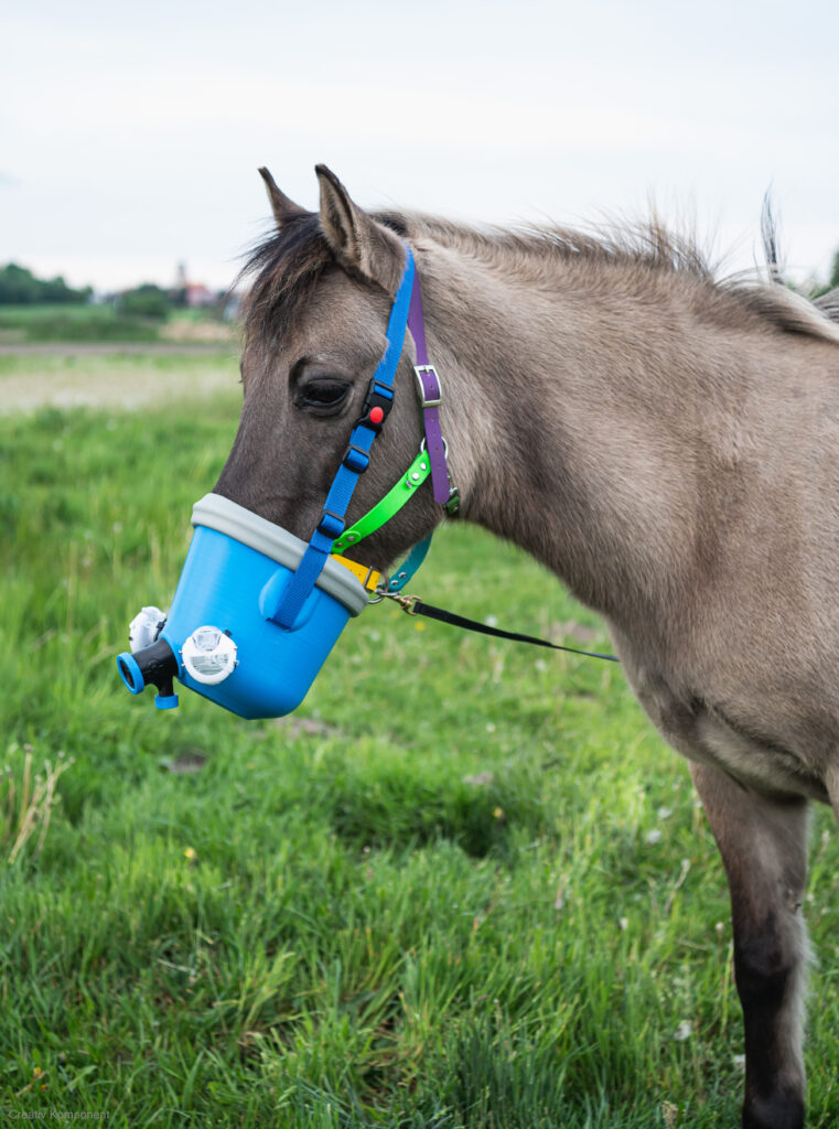 to profesjonalne rozwiązanie dla właścicieli koni, którzy chcą skutecznie podawać inhalacje swoim zwierzętom. Dzięki przemyślanej konstrukcji maska umożliwia stosowanie zarówno w warunkach stacjonarnych – z sieciowymi kompresorami tłokowymi – jak i w terenie, przy użyciu mobilnych urządzeń zasilanych bateryjnie.